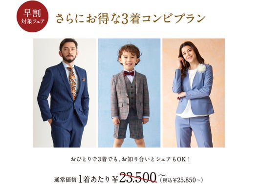 ※コンビプランとは・・・オーダースーツ2着以上ご購入していただいた場合の1着あたりのお値段です。組み合わせは自由ですので、異なる価格帯のオーダースーツと組み合わせていただいても本価格が適用されます。