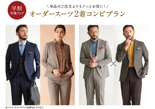 秋モノ新作×オールシーズンモノ×ビジネス×礼服、メンズ、レディースなど、お好きな組み合わせでオーダーが可能です。また、お知り合いやご家族と1着ずつのオーダーでもフェア適用となります。