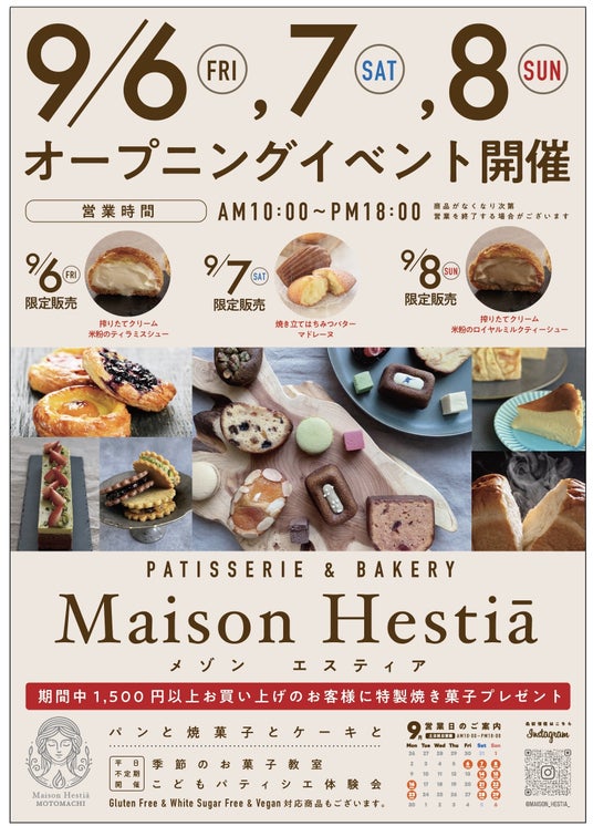 横浜・元町にニューオープンする「Maison Hestiā」では、厳選した素材を使用し、最新の技術を搭載したオーブンで焼き上げる健康に配慮した個性豊かなお菓子やパンを提供します。店名の「Hestiā」とは、ギリシャ神話の竈門の女神の名前から名付けられました。