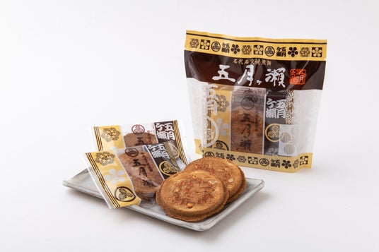 名代石窯焼煎餅五月ヶ瀬4枚入480円 ピーナッツが入ったクッキー風味のお煎餅で、素朴で飽きのこない独自の味わいです。福井県に根付いた1975年発売のロングセラー商品です。