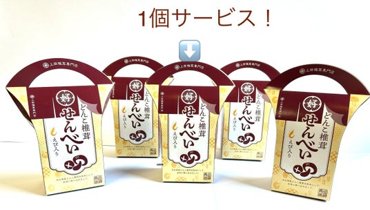 「どんこ椎茸せんべい」の新発売記念セールとして当店のインターネットショップにて「どんこ椎茸せんべい4個セット」をお買い上げのお客様にさらにもう1個「どんこ椎茸せんべい」を進呈させていただきます。