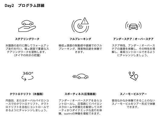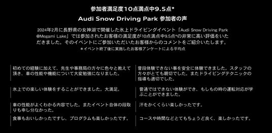 ウインターシーズン限定の本イベントを通じて、Audiオーナーの方やこれからAudiのご購入を検討されている方へ、広くAudiの魅力を伝えるとともに運転技術の向上を図る機会をご提供いたします。