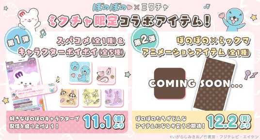 さらに12月2日(月)にはアイテム送信時にキャラクターが動く「キャラクターアニメーションアイテム」も実装予定であり、「ミクチャ」でしか見られない『ぼのぼの』をお楽しみいただけます。どのキャラクターがどのような演出で登場してくれるのかお楽しみに!