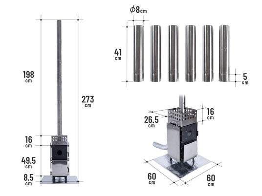薪ストーブは縦長形状にすることで(横長形状が一般的)、十分な蓄熱性を保ちながら幕内で省スペースで利用できるよう設計しました。