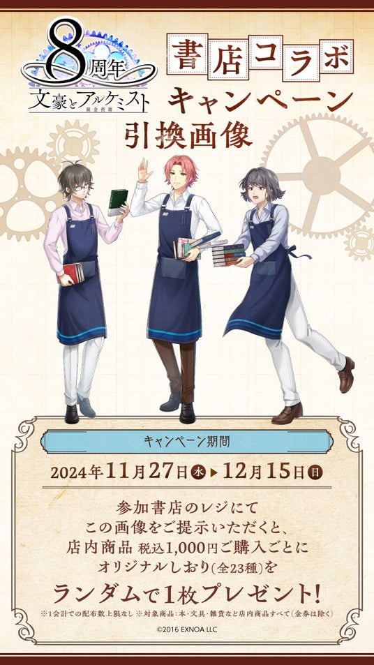 日本出版販売株式会社(代表取締役社長:奥村 景二、略称:日販)は、合同会社EXNOA(最高経営責任者:村中 悠介)が運営するDMM GAMESが手掛けるゲーム「文豪とアルケミスト」との書店コラボキャンペーンを、2024年11月27日(水)より全国557書店にて開催します。
