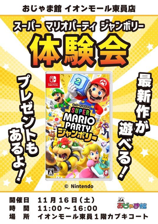 【スーパー マリオパーティ ジャンボリー】11月16日(土曜日)大好評のゲーム体験会を「おじゃま館 イオンモール東員店」にて開催します!