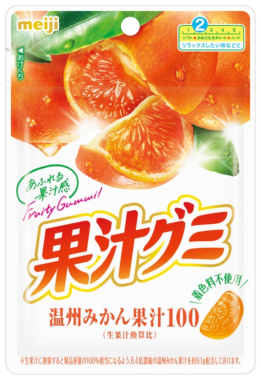 果汁100(生果汁換算比)、素材の色そのままのくだものグミ。
