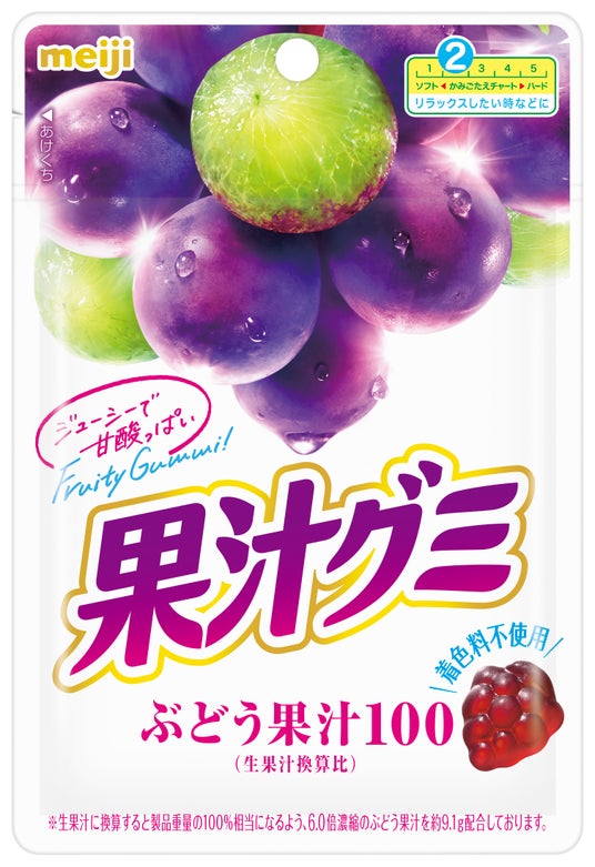 果汁100(生果汁換算比)、着色料不使用のくだものグミ。