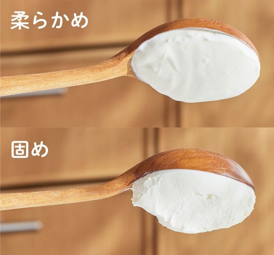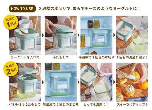 一般的な水切りヨーグルトメーカー同様、1段階目の水切りを容器の中で行った後、特別なバネ式の2段階目の水切りを行うことで、まるでチーズのように濃厚な、今までにない新感覚の水切りヨーグルトを作ることができます。ギリシャヨーグルトのようなやわらかさから、モッチリとして非常に濃厚なチーズのような味わいのものまで、水切りの時間で固さを調節できるから、さまざまなレシピをお楽しみいただけます。