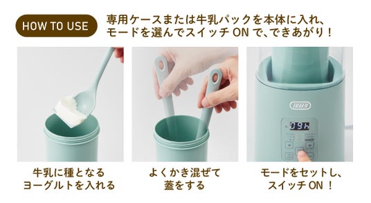 専用容器または牛乳パックを本体に入れ、牛乳に種となるヨーグルトを入れよくかき混ぜてから蓋をし、モードを選択してスイッチON!約8時間、放っておくだけでカンタンに自家製ヨーグルトが完成します。牛乳パックを使えばお手入れもラクラク。手軽に自家製ヨーグルトを作ることができます。