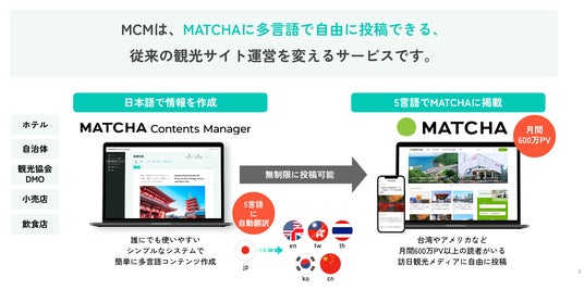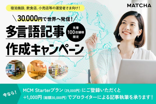 株式会社MATCHA(本社:東京都中央区、代表:青木優)は、観光関連事業者向けに、多言語発信を手軽に始められる特別キャンペーン「MCM Starterプラン」(先着100店舗)を実施します。