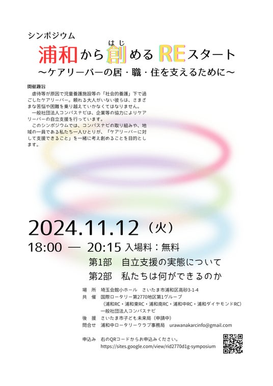 今回のシンポジウムでは、「浦和から創めるREスタート」をテーマに、社会的養護下で育った若者たちが抱える課題や支援の在り方について、様々な角度から議論を行います。