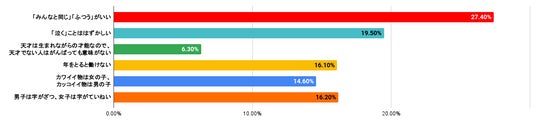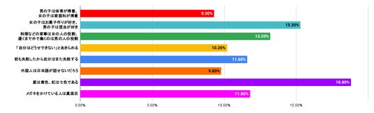 最も多くの票を集めたのは、「星は黄色、虹は七色である」の18.8%で、投票理由には、「絵本で見た」「アニメで見ると星は黄色で塗られているから」「イラストを描く時そう描くから」などが挙げられました。11.8%が投票した「メガネをかけている人は真面目」についても、「アニメのキャラクターがそうだから」といったコメントがあり、こども達がアニメーションなどのコンテンツから受ける影響が少なくないことが分かりました。次いで15.3%の票を集めた「女の子はお菓子作りが好き、男の子は昆虫が好き」については、「自分自身がお菓子を作ることが好き(女子)」「自分が昆虫好きだから(男子)」などの意見がありました。