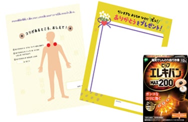 期間中、対象施設をご利用のお客さまに『ピップエレキバン130』(6粒、管理医療機器)と、ご家庭で効果的な肩たたきが実践できるチラシ「肩たたき大作戦」をプレゼントします。