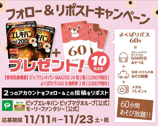 ピップエレキバン・ピップマグネループ公式Xとモーリーファンタジー公式Xアカウントにて、プレゼントキャンペーンを実施します。2024年11月11日(月)~23日(月)の期間、ピップエレキバン・ピップマグネループ公式Xの該当投稿をリポストして参加いただくと、抽選で「よくばりパス」や「ピップエレキバン」が当たります。
