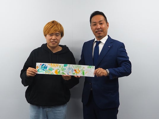壁画の下絵を手にするRIN氏と当社代表の新藤(右)