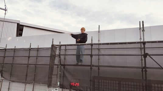 今回のプロジェクトのキャンバスとなった防塵壁は15m×4m(中央、RIN氏)