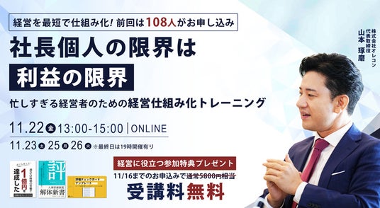 株式会社オレコン(本社:東京都港区、代表取締役:山本琢磨)は2024年11月開催:経営仕組化1dayトレーニング&実践ワークショップ説明会の募集を開始しました。