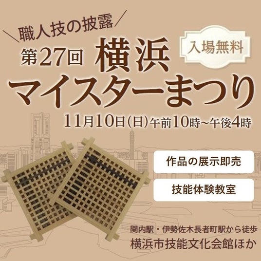 今年で27回目となる横浜マイスターまつり!横浜市では、市民の生活・文化に寄与する優れた職人を横浜マイスターに選定しています。11月10日は16職種の横浜マイスターが、関内の横浜市技能文化会館に大集合!匠の高い技術を体感していただくべく、作品の展示・販売・当日参加可能な体験教室・横浜マイスター特製ソーセージセットなどをご用意しています。ぜひ、皆様お越しください。