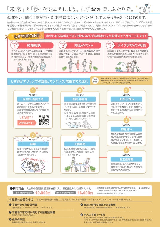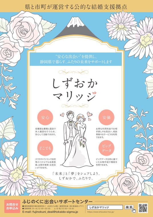 県と市町が運営する公的な結婚支援拠点「しずおかマリッジ」では、マッチングシステムによる出会いの機会の提供に加え、地域資源等を活用した各種イベント・セミナーを開催し、会員同士の直接の出会い・交流の場を提供しております。今回のイベントでは、男女各25名を上限に応募者を募り、大型マッチングイベントを開催します。