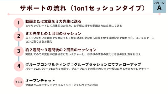 - 個別セッション/動画レクチャー:ご提供いただいた情報をもとに、発達に合った環境づくりやコミュニケーション方法をアドバイス(2回のセッションを実施)。
