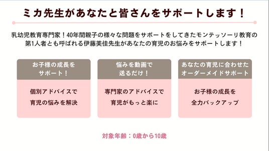 新サービス「ミカ先生!!うちの子どうですか!?」では、育児専門家・伊藤美佳が直接アドバイスを行い、各家庭のニーズに合わせたオーダーメイドのサポートを提供します。