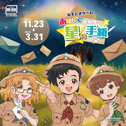 西武レクリエーション株式会社(本社:埼玉県所沢市、社長:依田 龍也)が運営する、複合型アミューズメント施設“BIGBOX東大和”(東京都東大和市)の屋内型キッズランド「あそびっぐ」では、2024年11月23日(土・祝)から2025年3月31日(月)までの期間、謎解きエンターテインメント第三弾『あそびっぐ探検隊と星の手紙』を開催します。