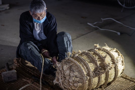 食の文化祭の初日夕方、俵を補修する分野他美雄さん 89歳 (池田町在住)