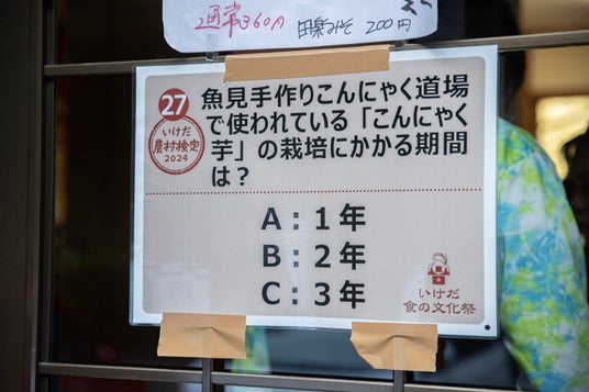 今年も各店舗に設置している池田町にかかわる問題をクイズラリー形式で解く「いけだ農村検定」を実施しました。問題は3択問題で、全店舗に設置された問題を解き(上限15問)、15問正解「名人級」、10~14問正解「1級」、5~9問正解「2級」、1~4問正解「3級」に分類し、正当数に応じたプレゼントに応募していただきました。来場者は、難しい問題のヒントを出店者から教えてもらうなど、来場者と出店者の交流を促す企画にもなりました。