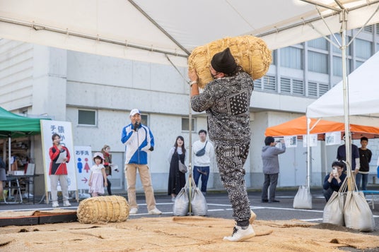 初めて見る米俵に興味津々に見入る方も多く、参加者が俵を持ち上げると、会場からは多くの拍手や歓声が飛び交いました。また、家族で挑戦する人や毎年参加する方も見られ、アドバイスが飛び交うなど会場は大いに盛り上がりました。