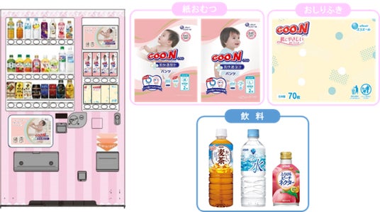 自動販売機では、飲料のほか、紙おむつ小パック(2枚入)、おしりふきを購入することができます。