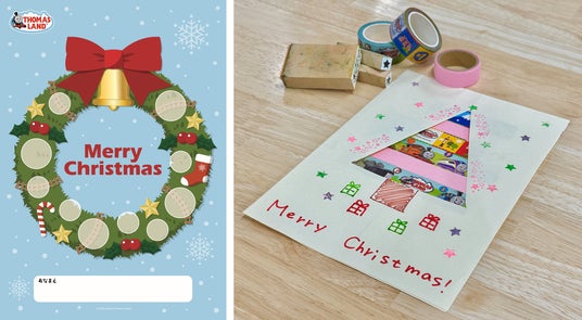 (3)来場者プレゼント!工作に使える「シールセット」トーマスランド内でサンタ帽を身につけたスタッフに「メリークリスマス!」と声をかけると工作ファクトリーでも使えるシールセットをプレゼ