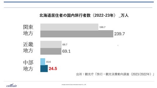 北海道から中部地方への旅行者数が前年比157%まで増加