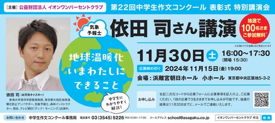 公益財団法人イオンワンパーセントクラブは、第22回中学生作文コンクールの表彰式と特別講演会を2024年11月30日(土)に浜離宮朝日ホール小ホールにて開催します。