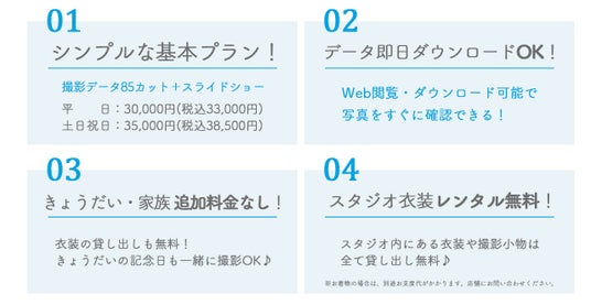 3パターン85カットをお渡しできるため、カジュアルもフォーマルも撮影可能です。