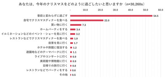そして、今年のクリスマスならではの特徴として、5年ぶりにクリスマスイブ・当日ともに平日です。「今年のクリスマスをどのように過ごしたいと思いますか。」という質問に対して、「普段と変わらずに過ごす(54.5%)」に次いで多かったのは、「自宅でクリスマスディナーを食べる(22.0%)」。物価高や平日ということもあり、「自宅で過ごす」方が多い傾向ということがわかりました。