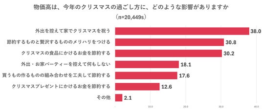 まず、過去一番物価高なクリスマスを迎えるにあたり、「昨年と比べて、今年のクリスマスで使う金額には物価高の影響があると思うか」という質問に対して、全体の約68%が「影響がある」と回答。「影響がある」と答えた方には、「どのように影響をするか」質問をしたところ、「外出を控えて家でクリスマスを祝う(38.0%)」、「クリスマスの食品にかけるお金を節約する(30.2%)」など、節約の工夫をする傾向があることがわかりました。