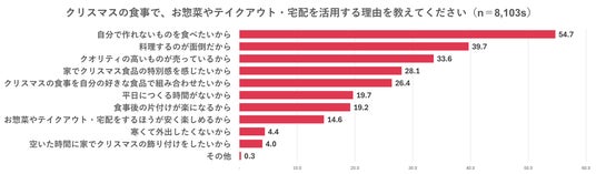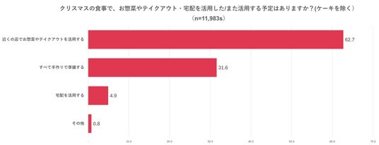 また、自宅でクリスマスディナーを食べると答えた人に対して「クリスマスの食事で、お惣菜やテイクアウト・宅配を活用した/また活用する予定はあるか」という質問をしたところ、「近くの店でお惣菜やテイクアウトを活用する(62.7%)」と答えた人が最も多く、「すべて手作りで準備する(31.6%)」「宅配を活用する(4.9%)」と続く結果となりました。