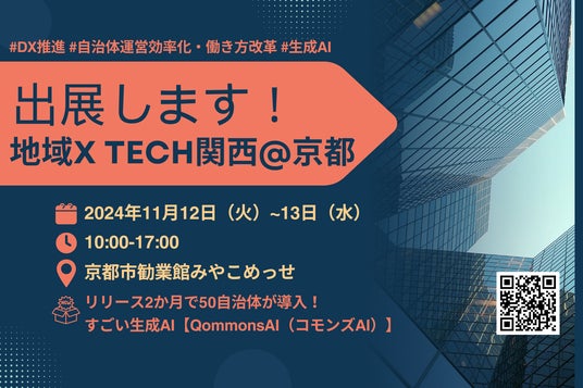 Polimill株式会社(本社:東京都港区、代表取締役:横田えり、以下Polimill社)は、自治体DXを支援するAI業務支援ツール「Qommons AI(コモンズAI)」を、2024年11月12日(火)・13日(水)に京都市勧業館みやこめっせで開催される「地域×Tech関西」に出展いたします。