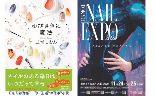 『ゆびさきに魔法』の書影(左)と「東京ネイルエキスポ2024」のポスター