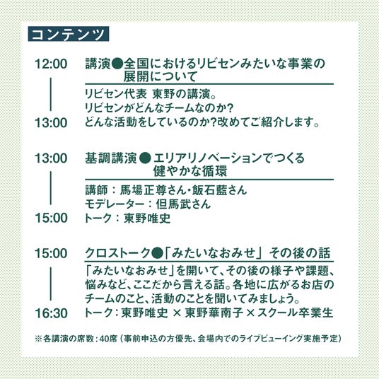 リビセン代表東野によるリビセンご紹介やゲストを招いたトークコンテンツを予定しています。