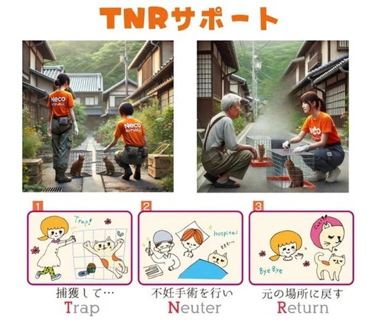 <TNRサポート>相談会で野良猫が多い地域をリサーチします。餌やりをして、野良猫を増やしてしまった現場では、TNRが必要とわかっても、当事者だけでは、なかなか捕獲ができず猫が増えてしまうことも多くあります。プロの知識と技術をもった専任者が迅速に現場でTNRを実施します。