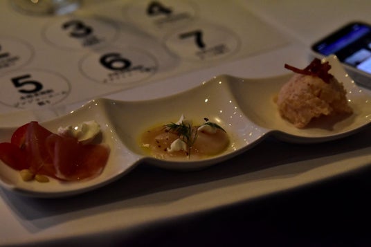 さまざまな種類の本格焼酎&泡盛とそれぞれに合わせたおつまみの相性を体感する「ペアリングを体験!」のコーナーでは、「本格芋焼酎の前割りと生ハムクリームチーズ」「泡盛の炭酸割りとホタテのカルパッチョ」「オンザロックの本格蕎麦焼酎とタラモサラダ カリカリベーコン添え」の3種のペアリングを賞味。