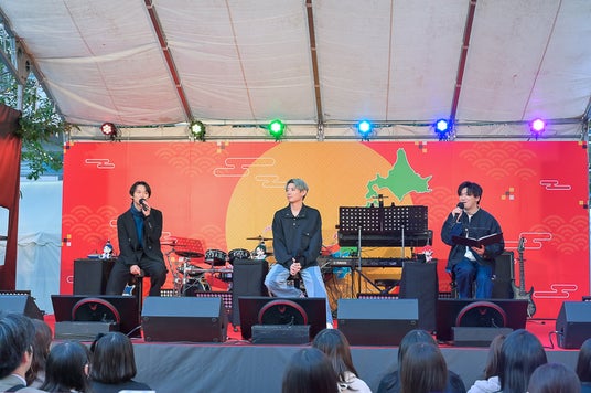 ▲噴水広場ステージの様子(左から浦 和希さん、佐藤 元さん、大塚 剛央さん)