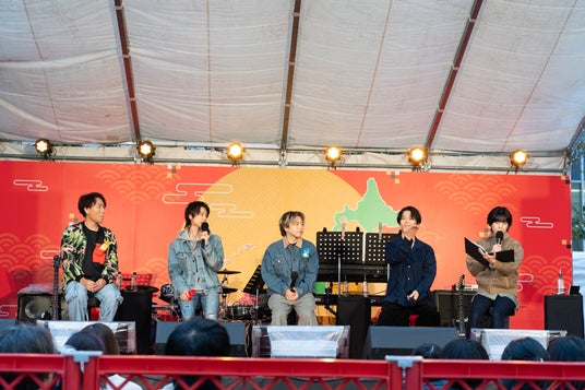 ▲噴水広場ステージの様子(左から内田 秀さん、戸谷菊之介さん、井澤詩織さん、土岐隼一さん)