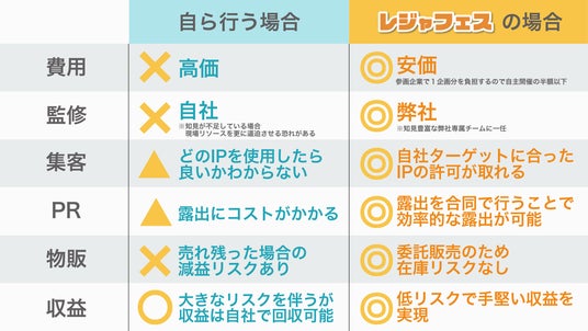 弊社がプロデュース企業として全体統括を行うため、自社単体でIPコラボを行うことが難しい企業にとっては実施ハードルが下がり、かつ開催費用の圧縮、および準備工数を大幅に削減することができます。