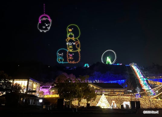 すみっコぐらしのキャラクターが夜空を彩るドローンライトショー開催!