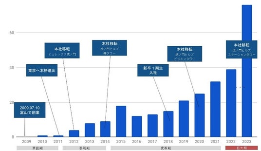 私たちは今年で創業15年を迎えたベンチャー企業です。2009年7月、現リクルート出身の代表・長井が故郷の富山市で起業し、2012年から東京に移転しました。虎ノ門ヒルズ森タワー、同ビジネスタワーなどに入居し、2024年3月からは同ステーションタワーにオフィスを構えています。
