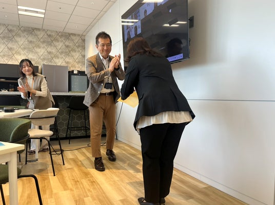 光が差し込む新しいラウンジで、バックには、リモート参加の社員が映し出された大きなスクリーン。亮さんから、辞令と共に名前が刻まれた入館証ホルダーが贈られ、拍手で閉会しました。