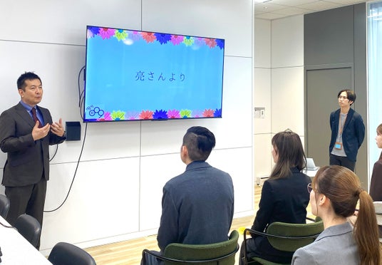 2024年10月4日に開いた、2025年4月入社の学生の内定式。代表「亮さん」(※全員あだ名で呼び合う文化)が「アールナインを選んでくれた今の気持ちを大切にして下さい。まだまだ変化に耐えなければならないベンチャー企業ですが、行動を起こし現状をより良く変える方法を考えていきましょう」と語り掛けました。